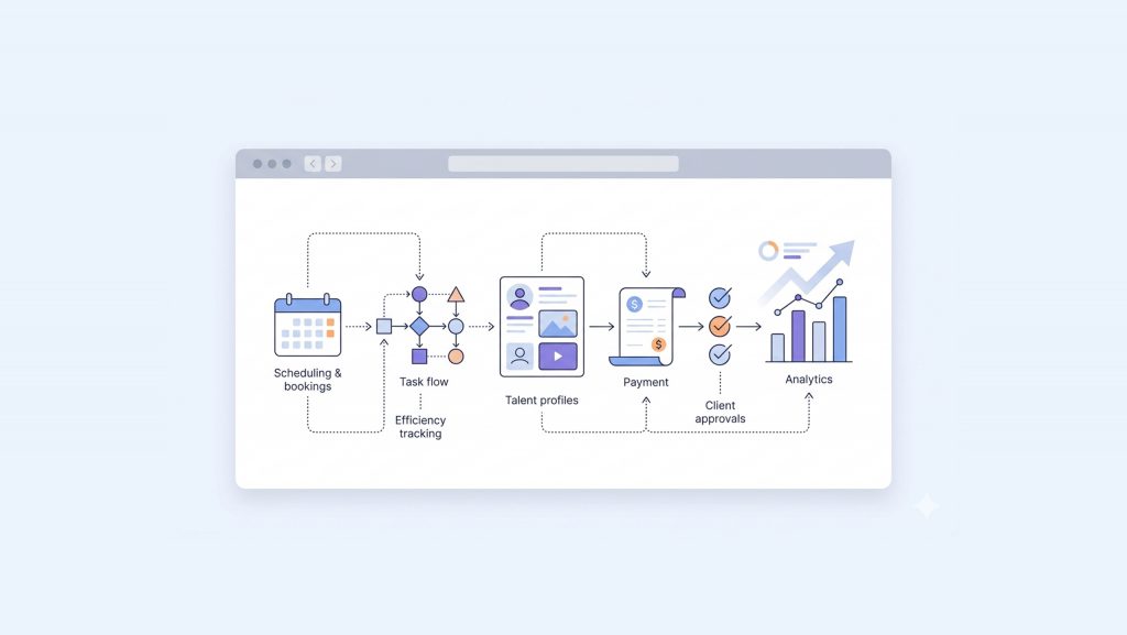 Within minutes, an agency can check booking calendars and spot conflicts, review pending client approvals, see exactly which invoices are outstanding and by how many days, confirm talent availability, and get a real-time snapshot of overall workflow health.